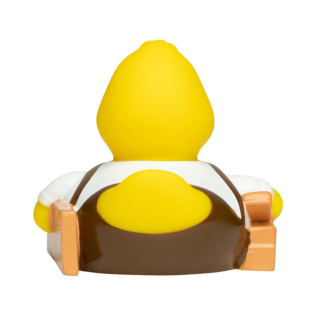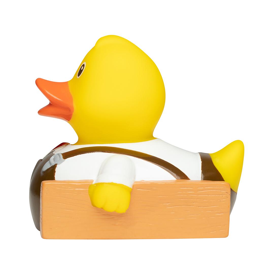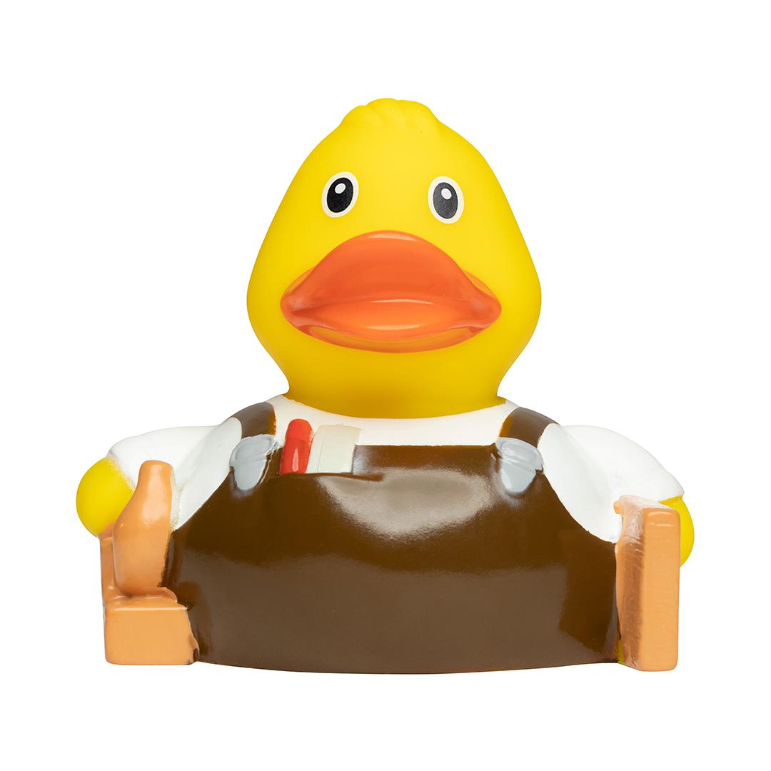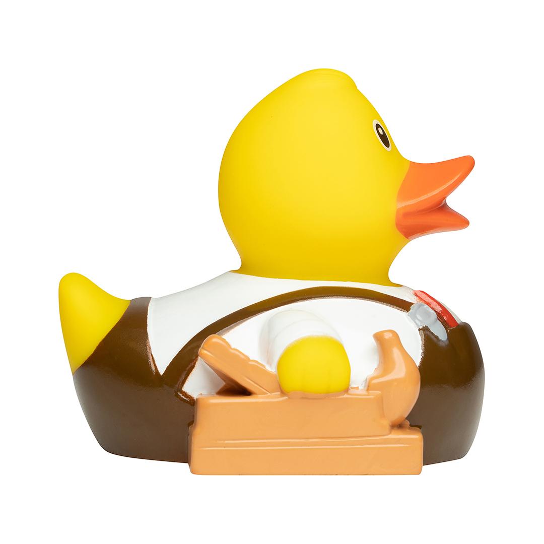 Quietsche-Ente Tischler, die Fachente für alles rund ums Holz. In klassischer Tischlermontur mit brauner Latzhose, Hobel und Holz macht sie den Vertretern dieses Berufes alle Ehre und ist ein schönes Give away nach getaner Arbeit und eine schöne Zierde für Werkstätten und Ausstellungsräume.