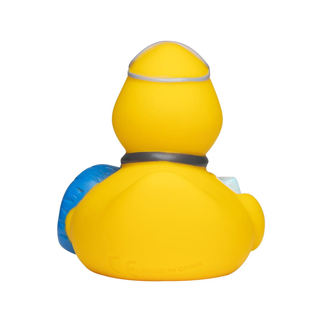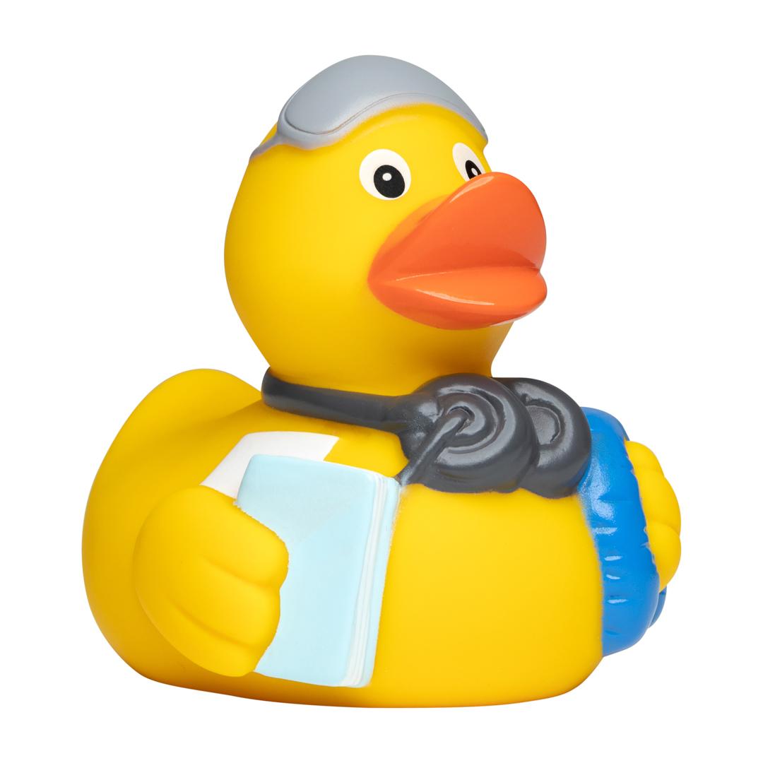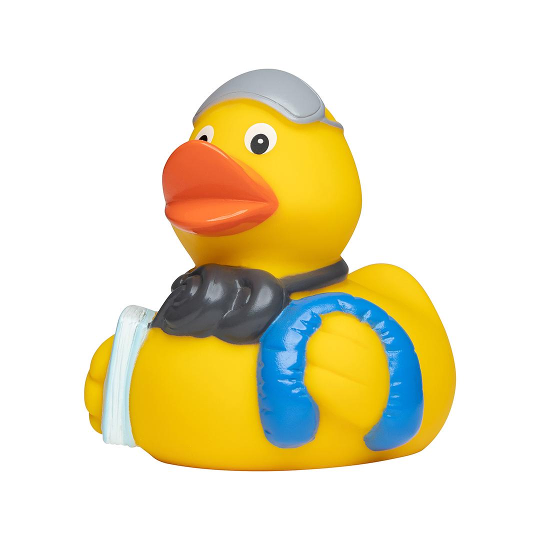 Hier ist ein echter Reise-Profi unterwegs. Als Vielflieger weiß die Badeente genau, was auf einer langen Reise gebraucht wird. Über die Kopfhörer dudelt die Lieblingsmusik und für eine Schmökerrunde ist ein spannendes Buch dabei. Anschließend kuschelt sie sich mit dem Nackenhörnchen und der Schlafmaske in den Sitz und träumt von einer Schwimmrunde im kühlen Nass.